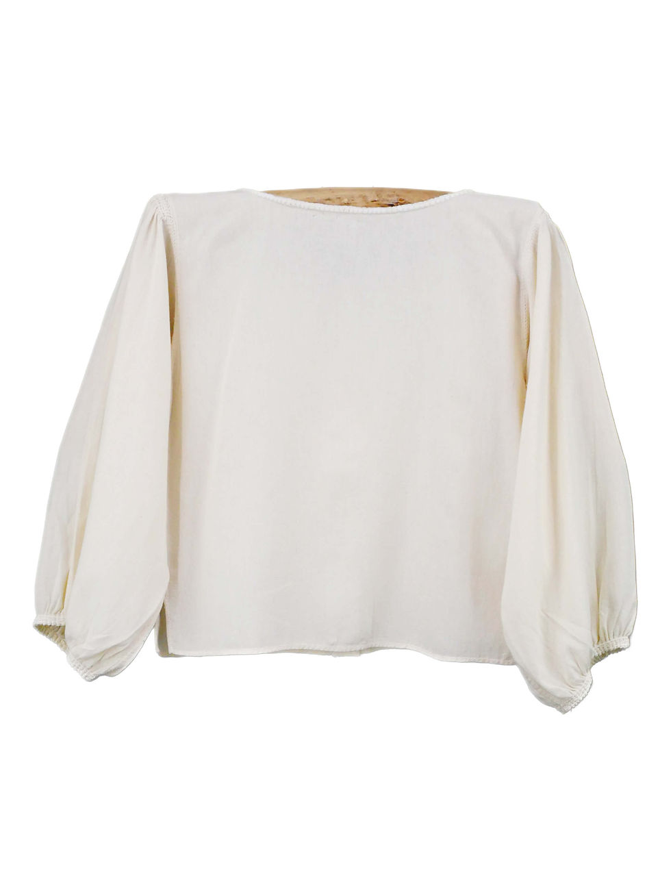 Les broderies sont placées avec soin sur le buste, les manches ou l’ourlet, composant un équilibre graphique propre à chaque pièce. Motifs floraux stylisés, marguerites ou papillons s’expriment en fil ton sur ton ou en couleurs vives, toujours brodés à la main. Chaque variation témoigne de la main de l’artisane, et confère à chaque blouse son unicité.