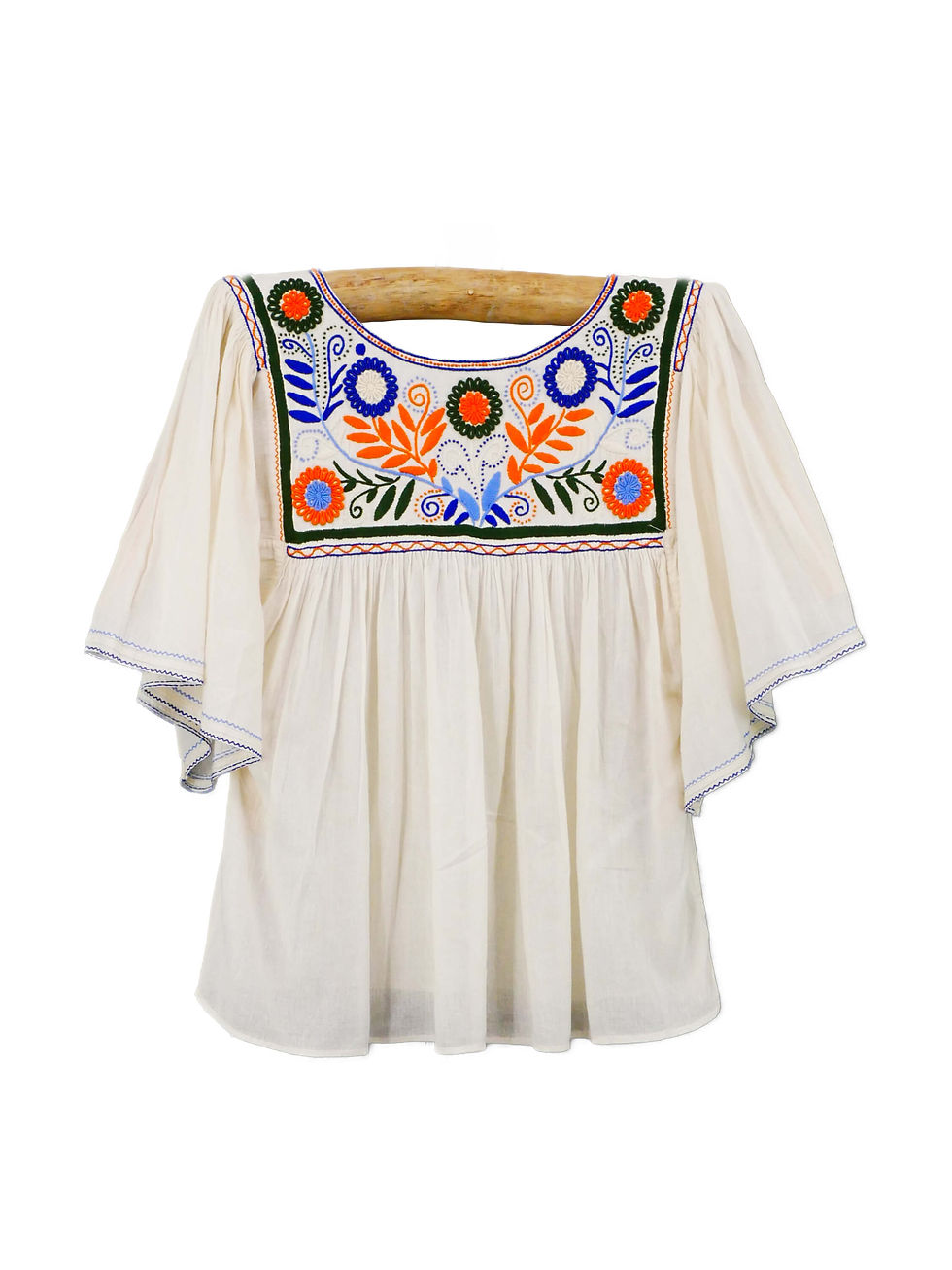 Les broderies sont placées avec soin sur le buste, les manches ou l’ourlet, composant un équilibre graphique propre à chaque pièce. Motifs floraux stylisés, marguerites ou papillons s’expriment en fil ton sur ton ou en couleurs vives, toujours brodés à la main. Chaque variation témoigne de la main de l’artisane, et confère à chaque blouse son unicité.